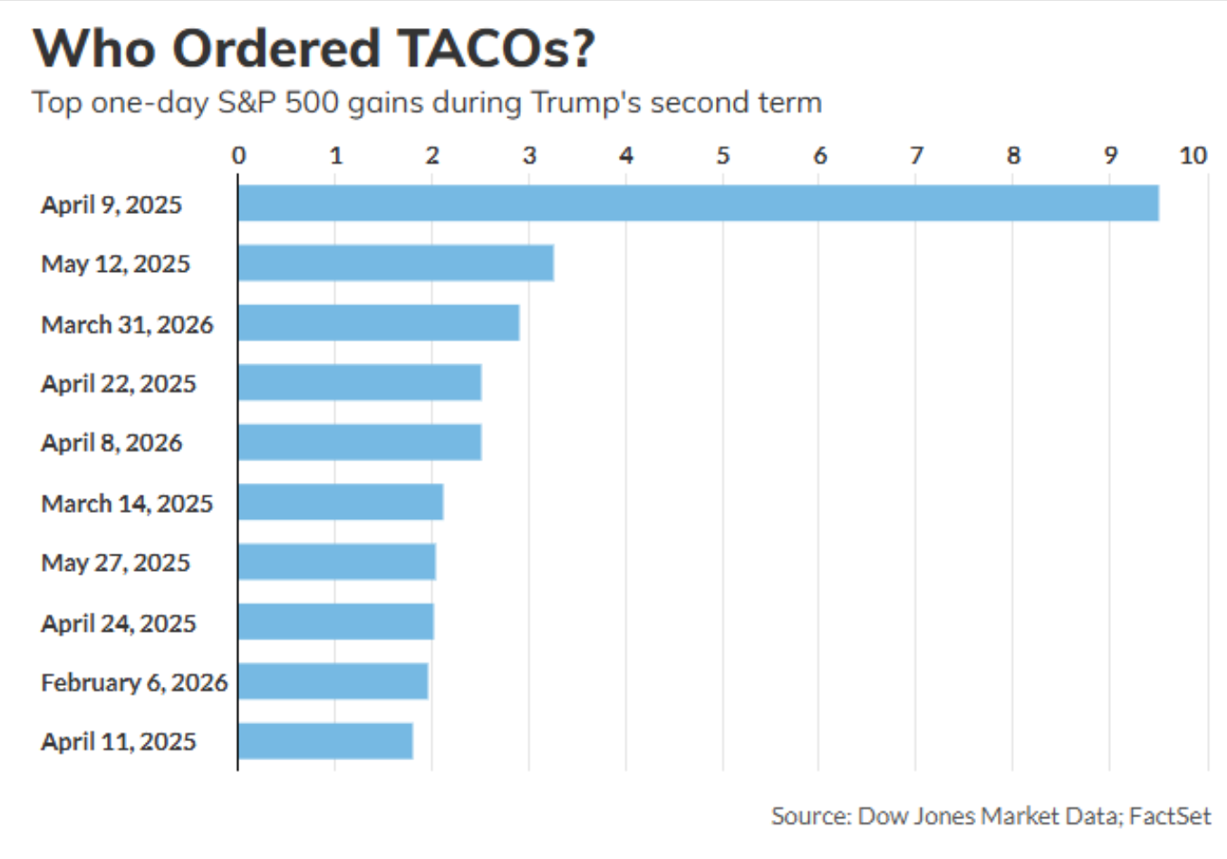 业内人士统计显示,在特朗普2.0任期(自2025年1月上任以来)标普500指数的十大单日涨幅里,有9次主要归功于白宫在关税政策或与伊朗冲突方面的降温或妥协迹象,即标普十大涨幅日9个和TACO有关。