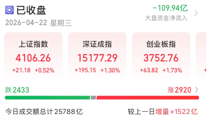 4月22日,受外围市场波动影响,A股开盘走低,但随后快速企稳并走出独立行情,放量震荡走高。当日沪指重返4100点整数关口,创业板指再创阶段性新高,市场交易总量增至2.58万亿元。不过,板块及个股分化态势明显,通信、电子、计算机等成长型板块表现强势,而防御性板块则走势疲软。
