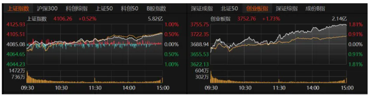 早盘指数低开,随后回升翻红,午后继续上攻。沪指收涨0.52%报4106.26点,创业板指收涨1.73%报3752.76点,深证成指收涨1.3%。科创50、北证50均涨近2%,沪深300收涨0.66%,上证50微跌。