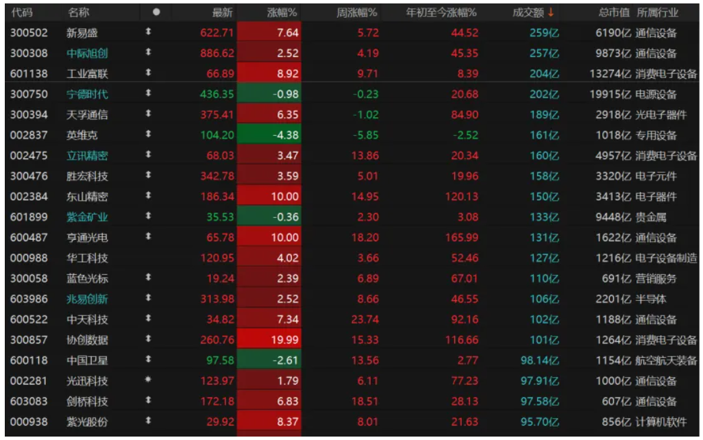 个股涨跌互现:2920只个股收涨,涨停股63只;2433只个股收跌,跌停股15只。今日有16只个股日成交额超过100亿元,多数为科技股且上涨居多。CPO概念龙头股“易中天”(中际旭创、新易盛、天孚通信)均大涨,东山精密、亨通光电涨停,协创数据更是“20cm”涨停。