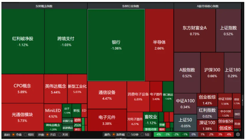 盘面上,半导体、通信设备、CPO概念、光通信模块、电子元件、消费电子设备等科技股大涨。