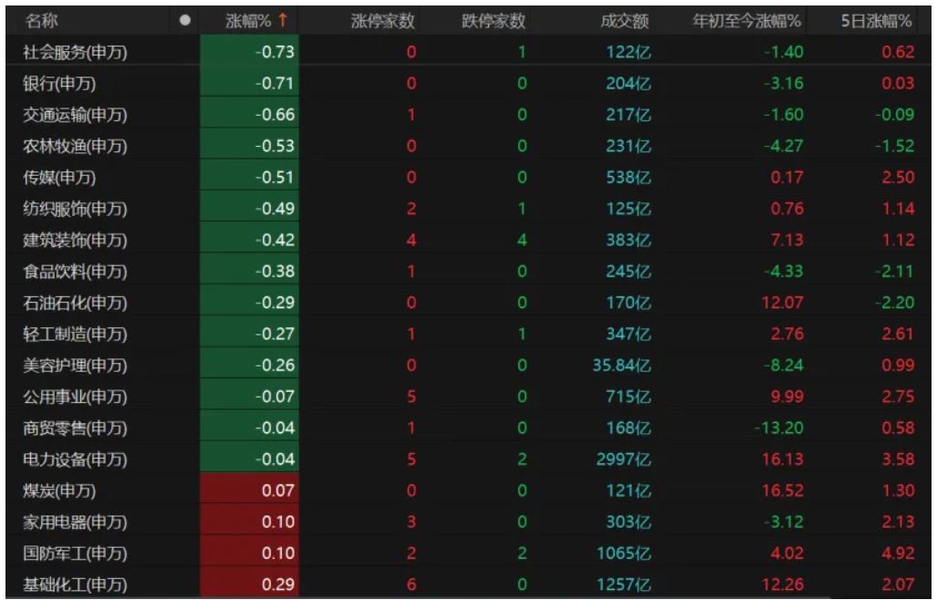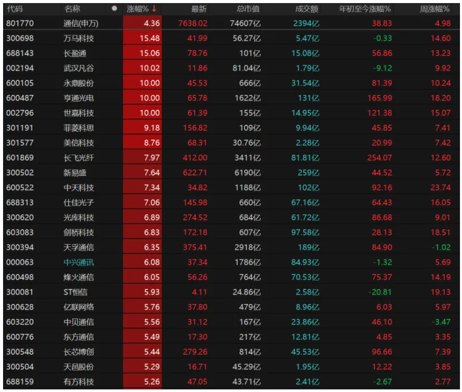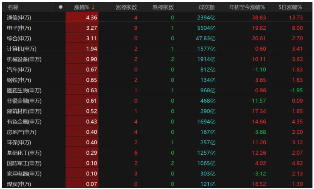 资金明显流向科技股,通信板块继续领涨,年内涨幅累计近39%。电子、综合涨幅均超过3%,计算机、机械设备、汽车、医药生物等板块表现亦较活跃。