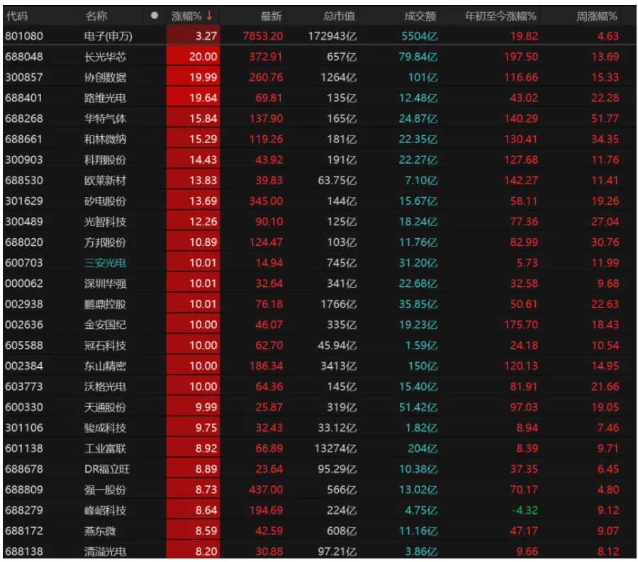 9只电子股涨停,长光华芯、路维光电“20cm”涨停,华特气体、和林微纳、科翔股份、欧莱新材均大涨,三安光电、深圳华强、鹏鼎控股、金安国纪、冠石科技等个股均涨停。