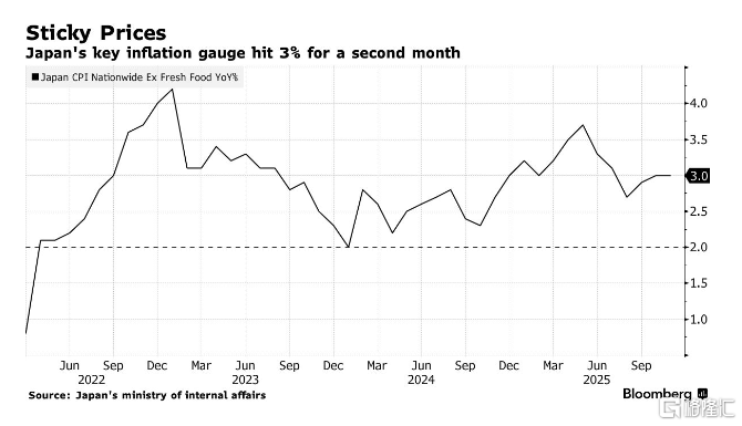 当地时间19日,日本总务省发布的最新数据显示,日本11月全国核心CPI同比上涨3.0%,连续第44个月高于日本央行设定的2%政策目标。