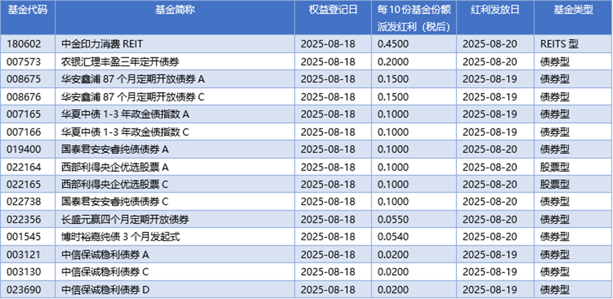 (1)08月18日新发基金共有65只,主要为股票型基金和ETF联接基金基金,其中华夏上证科创板半导体材料设备主题ETF联接C募集目标金额达80.00亿元亿元;基金分红15只,多为债券型,派发红利最多的基金是中金印力消费基础设施封闭式基础设施证券投资基金,每10份基金份额派发红利0.4500元。