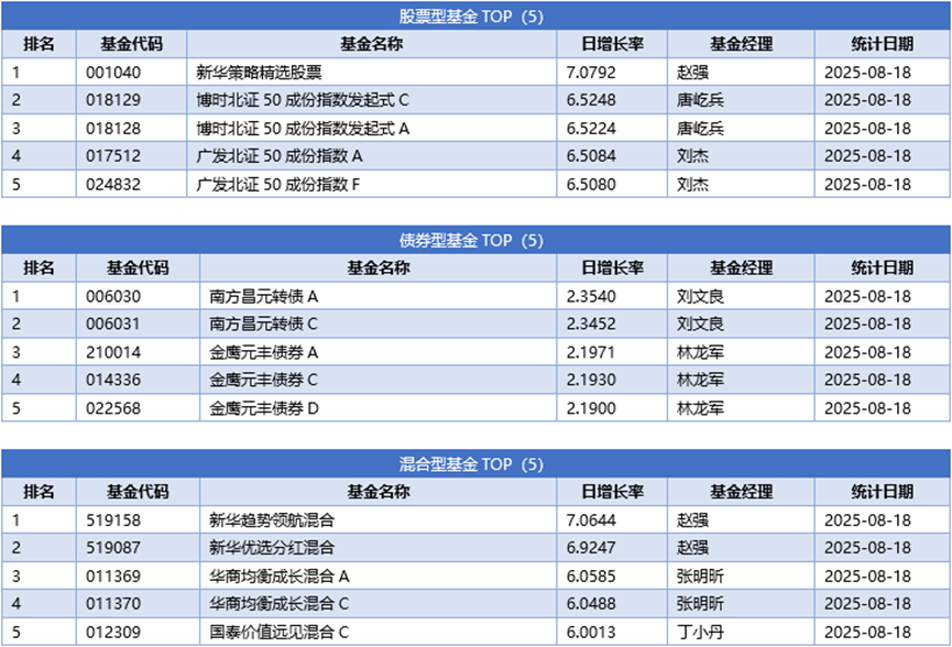 单基金方面,剔除掉 创新封基类型 基金的影响,08月18日业绩表现最好的基金为新华策略精选股票,日增长率为7.0792%,其次为新华趋势领航混合,日增长率为7.0644%、新华优选分红混合,日增长率为6.9247%。