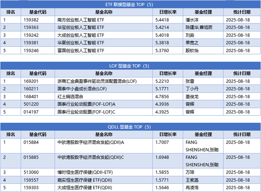 分投资类型看,同样剔除掉分级杠杆及固定收益两类基金的影响,股票型基金冠军为新华策略精选股票,日增长率为7.0792%;债券型基金冠军为南方昌元转债A,日增长率为2.3540%;混合型基金冠军为新华趋势领航混合,日增长率为7.0644%;货币型基金冠军为信澳慧理财货币E,日增长率为0.0103%;ETF联接基金冠军为南方创业板人工智能ETF,日增长率为5.4418%;LOF型基金冠军为浙商汇金鼎盈事件驱动灵活配置混合(LOF),日增长率为5.2210%;QDII基金冠军为中欧港股数字经济混合发起(QDII)A,日增长率为1.7007%;下面是不同类型基金日增长率TOP5 (剔除掉分级基金的影响)