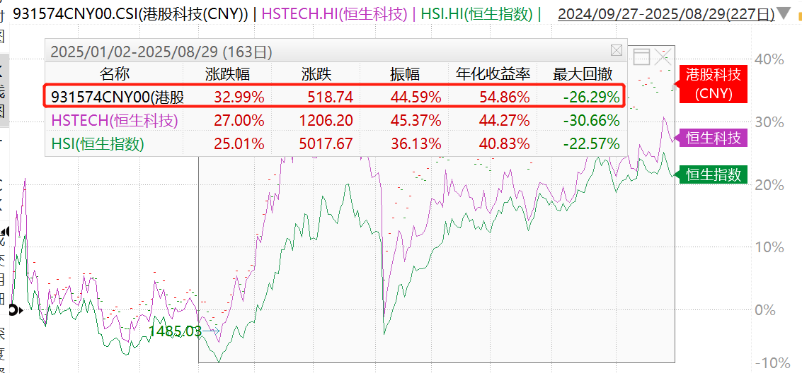 从年内表现来看,截至8月29日收盘,港股科技指数(人民币汇率)累计涨近33%,恒生科技指数涨27%。