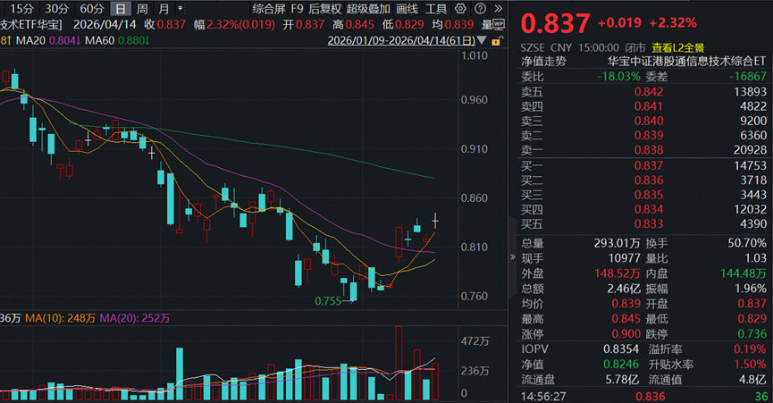 注①:“全市场首只”是指全市场首只跟踪中证港股通信息技术综合指数的ETF。截至2026.4.13,港股通信息技术ETF华宝最新场内规模为4.77亿元,为当前跟踪中证港股通信息技术综合指数的4只已上市ETF中规模最大;今年以来港股通信息技术ETF华宝的日均成交额为1.2亿元。