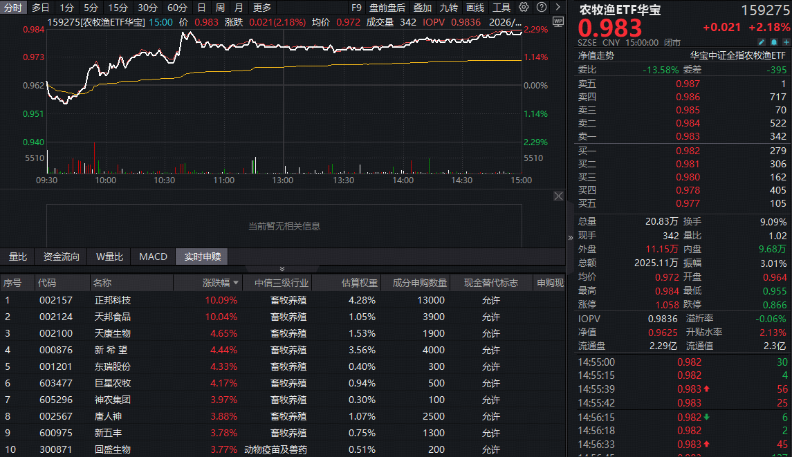 【重磅政策出台!正邦科技、天邦食品双双涨停,华宝基金农牧渔ETF(159275)猛涨2.18%!配置窗口已开?】