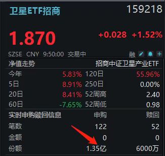 破4000000000元!卫星ETF招商(159218)盘中怒揽近1.4亿规模再创阶段新高!航天电子、中国卫星飙涨