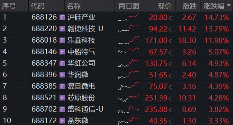 个股多数飘红,权重龙头寒武纪、海光信息携手11连涨,中船特气、仕佳光子盘中再探历史新高,此外,沪硅产业、翱捷科技-U、乐鑫科技等涨幅居前。上周五登上A股“股王”的源杰科技短线收跌3.97%,股价回落至1400元下方,被贵州茅台反超。