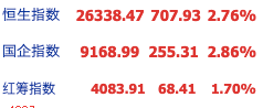 2026年的第一个交易日,港股走势强劲,迎来开门红。截至收盘,港股恒生指数涨2.76%,报26338.47点,恒生科技指数涨4%,报5736.44点,国企指数涨2.86%,报9168.99点,红筹指数涨1.7%,报4083.91点。