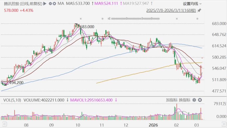 继昨日收涨超7%后,入选了2026年格隆汇“下注中国”十大核心资产名单的腾讯(0700.HK)今早再度涨4.43%,报578港元。