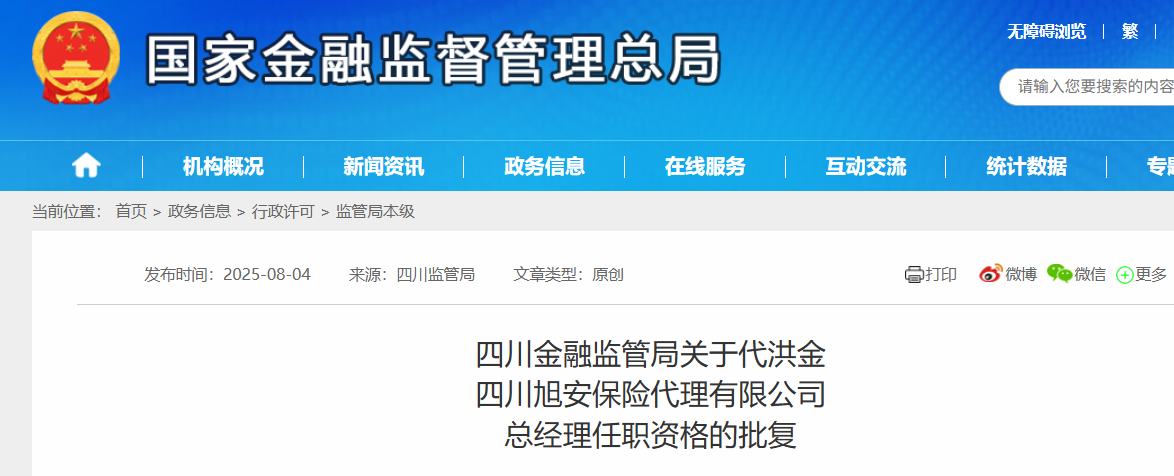 8月4日,国家金融监管局发布批复信息,核准代洪金四川旭安保险代理有限公司总经理的任职资格。