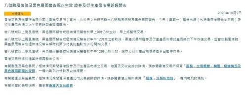 港交所网站发布消息,由于天文台现已发出八号台风信号及黑色暴雨警告,今天(星期一)证券市场(包括沪深港通北向交易)及衍生产品市场之上午交易时段会延迟开市。