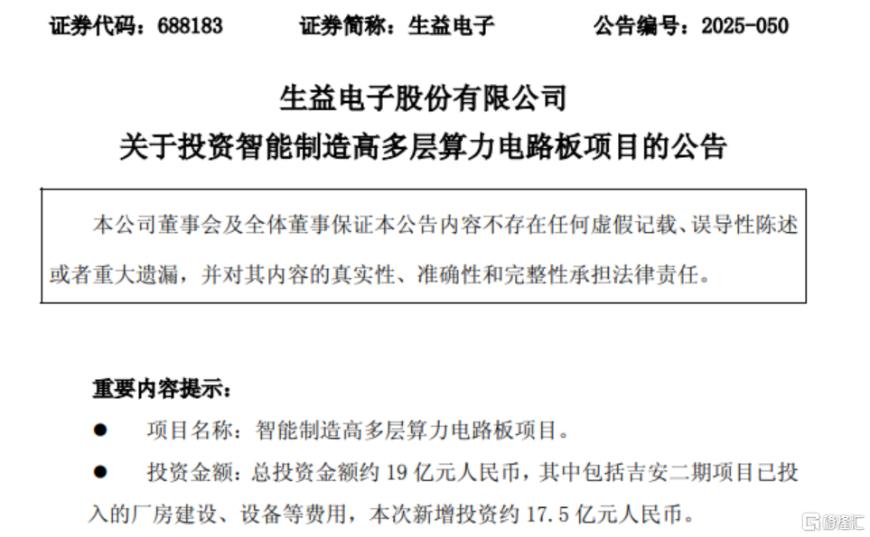 值得关注的是,生益电子还同步披露了最新投资项目公告,计划投资总额约19亿元用于智能制造高多层算力电路板项目,其中包含吉安二期项目已投入的厂房建设、设备等费用,新增投资约17.5亿元。
