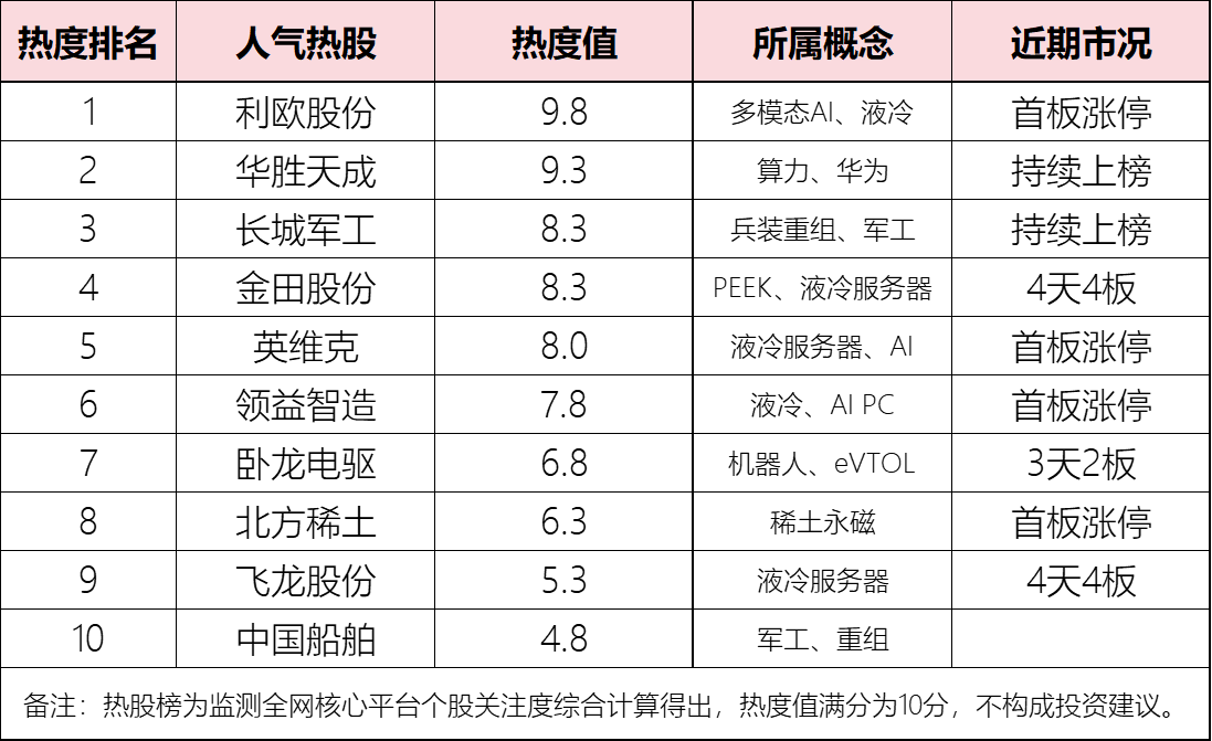 今日十大热股:液冷成最强风口,利欧股份热度爆棚,金田股份4天4板,华胜天成、长城军工高位再迎催化剂