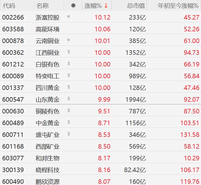 格隆汇10月9日|A股市场黄金概念股掀涨停潮,其中,浙富控股、高能环境、云南铜业、江西铜业、白银有色、四川黄金、山东黄金10CM涨停,铜陵有色逼近涨停,中金黄金、盛屯矿业、西部矿业、晓程科技、鹏欣资源涨超8%。消息面上,金价继续破顶,美联储本月降息0.25%的预期升温,加上美国政府持续停摆引发避险需求,刺激黄金现货价格昨日盘中升穿4000美元大关,最高涨至4059.25美元,再创历史新高。年初至今,金价已攀升超54%。多种因素推动黄金升势,包括减息预期、政治和经济的持续不确定性、央行的稳健买盘、黄金交易所交易基金流入以及美元疲软。