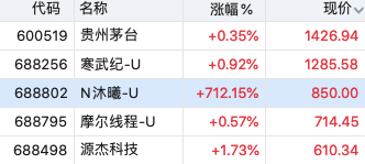 另外,以沪深上市的A股公司来看,沐曦股份股价仅次于贵州茅台、寒武纪,为第三高价股。