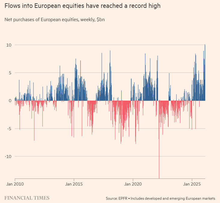 由于投资者希望降低对美国市场的曝露风险,加之对欧洲经济状况的乐观情绪日益增长,全球资金正以创纪录的规模涌入欧洲股市。