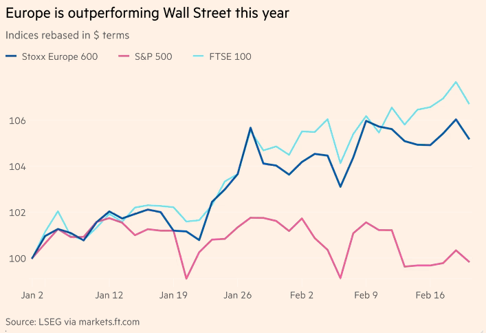许多投资者认为欧洲就提供了这样的机会:根据伦敦证券交易所集团(LSEG)的数据,斯托克欧洲 600 指数的市盈率为 18.3 倍,而标准普尔 500 指数为 27.7 倍。