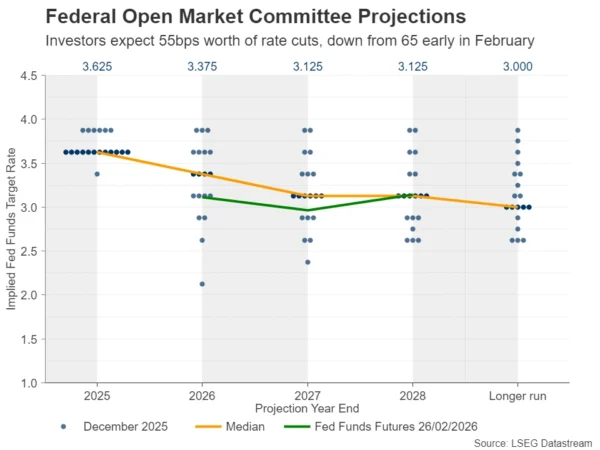 利率定价方面,投资者目前大致计入约55个基点的降息空间;而在2月初,市场预期约为65个基点,相当于两次25个基点降息,并对第三次降息给出超过50%的概率。利率预期之所以回撤,主要源于1月非农就业数据强劲后,部分美联储官员对“立刻继续宽松”态度趋于谨慎;此外,最新一次FOMC会议纪要(该次决议发生在就业数据公布前)显示委员会内部立场分化:一些委员在通胀居高不下时对加息持开放态度,另一些则倾向于在通胀进一步降温时支持更多降息。