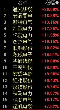 早盘,电网设备板块大爆发,通光线缆20CM涨停,安靠智电涨超18%,新特电气、灿能电力、亿能电力、双杰电气涨超10%,顺钠股份、积成电子、华通线缆、三变科技、宏盛华源涨停,红相股份、汉缆股份涨超9%,神马电力、保变电气涨超8%。