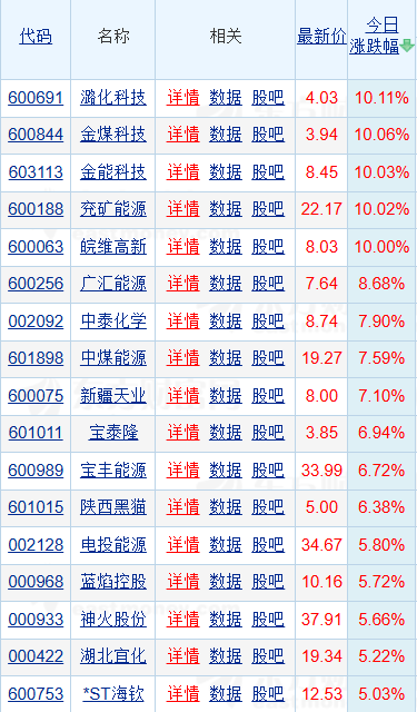 早盘,煤化工(核心股)板块爆发,板块内潞化科技、金煤科技、金能科技、兖矿资源、皖维高新5只个股涨停,广汇能源、中泰化学、中煤能源、新疆天业涨超7%,宝泰隆、宝丰能源、陕西黑猫涨超6%。
