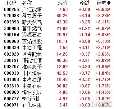 A股市场油服(核心股)板块同样大幅拉升,广汇能源、科力股份涨超8%,通源石油涨超5%,中油工程、贝肯能源、潜能恒信、中海油服、中曼石油纷纷上涨。