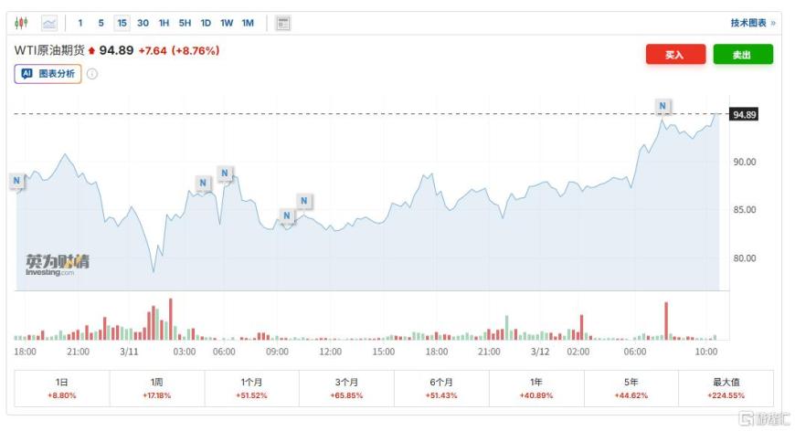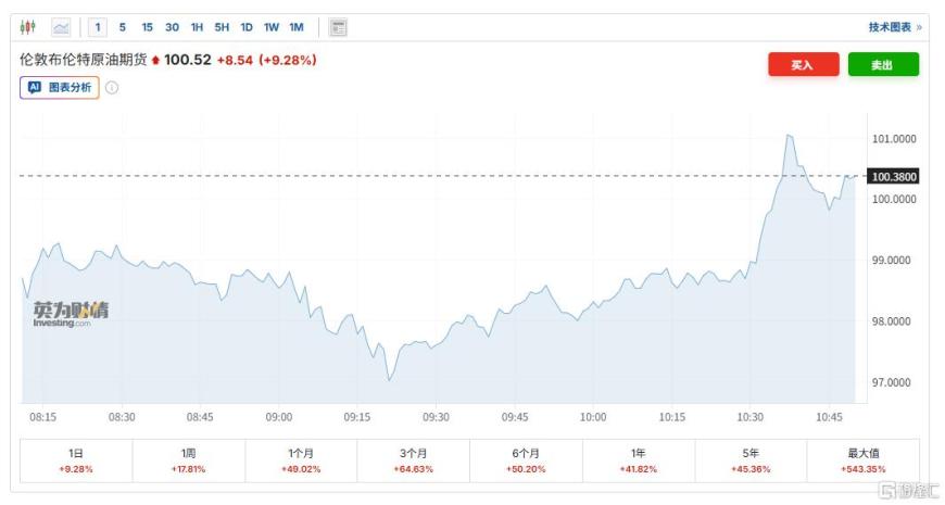 这一消息再度引发了油价的拉升,WTI原油期货突破94美元/桶,现涨8.79%;布伦特原油期货突破100美元/桶,现涨9.28%。