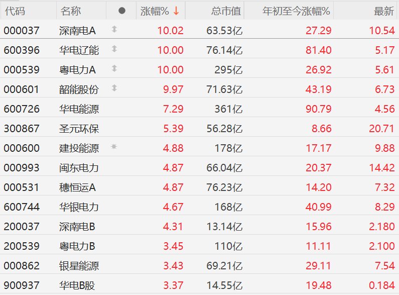 3月18日,A股市场电力股全线上涨,截至收盘,深南电A、华电辽能、粤电力A、韶能股份10CM涨停,华电能源涨超7%,圣元环保涨超5%,建投能源、闽东电力、穗恒运A、华银电力、深南电B涨超4%。