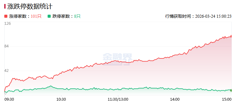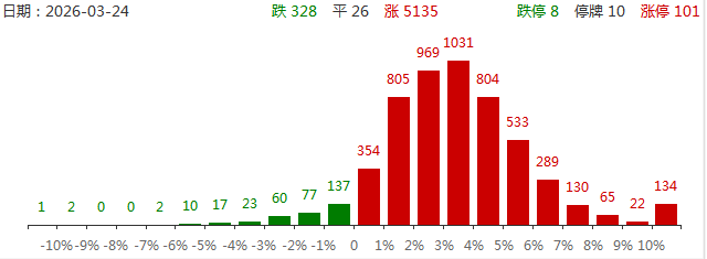 3月24日,美伊谈判的希望日益增强,A股三大指数今日探底回升,截至收盘,沪指涨1.78%报3881点,深证成指涨1.43%,创业板指涨0.5%。全市场成交额2.1万亿元,较前一交易日缩量3520亿元,超5100股上涨,101股涨停。