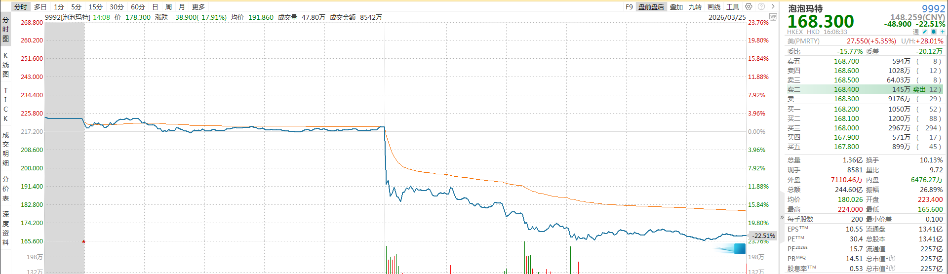 2. 量化交易与做空资金放大跌幅:财报发布后,泡泡玛特量比、成交额、换手率均大幅飙升,远超近期日均水平。程序化交易在股价破位后触发止损抛盘,叠加港股做空资金借机加码,形成“下跌→止损→进一步下跌”的负反馈,快速放大跌幅。