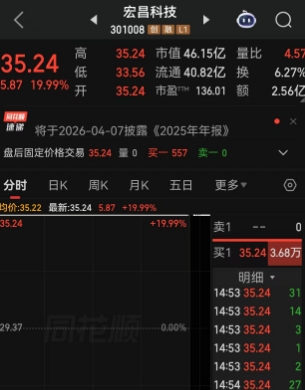受张雪机车夺冠影响,宏昌科技今日开盘大涨“20cm”,截至今日收盘,宏昌科技报35.24元/股,上涨20%。