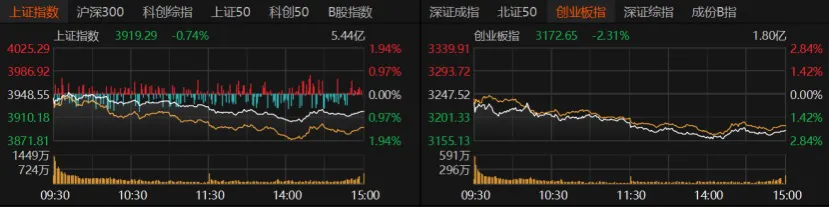 指数表现不佳,午后加速下行,双创指数大跌。沪指收跌0.74%报3919.29点,创业板指收跌2.31%报3172.65点,深证成指收跌1.6%。科创50收跌2.77%,沪深300、上证50跌约1%,北证50微红。