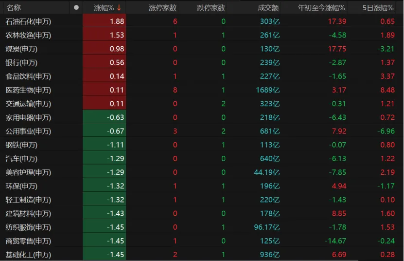 31个申万一级行业中,石油石化板块涨近2%,博汇股份“20cm”涨停,中油工程、和顺石油、康普顿、蓝焰控股、贝肯能源涨停;农林牧渔、煤炭、银行、食品饮料、医药生物、交通运输等板块均收红。