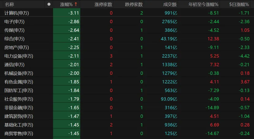 计算机板块跌逾3%,电子、传媒、房地产、电力设备、通信、机械设备、有色金属、国防军工等板块跌幅靠前。