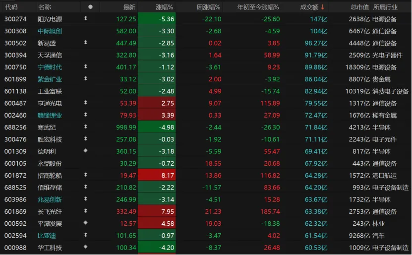 个股跌多涨少,共计4378只个股收跌,跌停股16只;1052只个股收涨,涨停股32只。今日仅有两只个股日成交额超过100亿元,阳光电源收跌5.36%报127.25元/股,中际旭创收跌3.3%报582元/股。