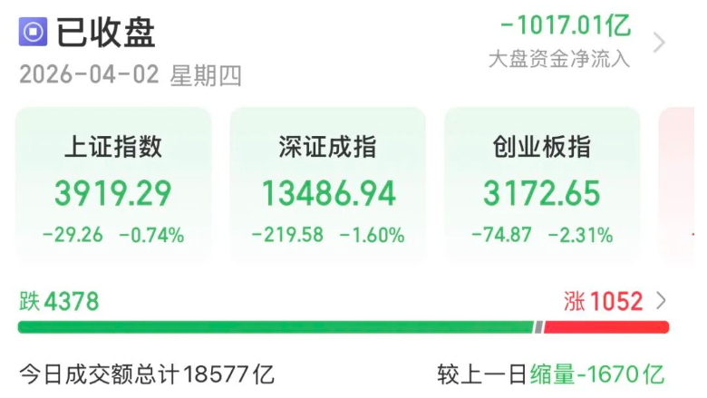 排排网财富分析,今日A股缩量大跌,主要原因有二:一是临近清明小长假,资金避险情绪升温,导致市场承接力不足、成交缩量;二是市场进入年报密集披露期,高估值科技成长板块面临业绩验证压力,资金提前流出规避风险。
