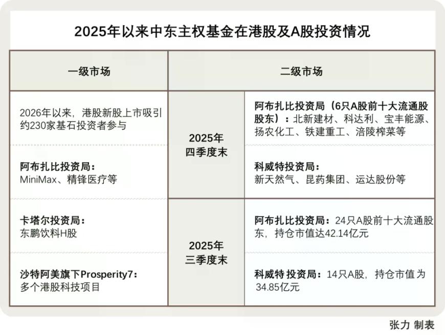 一级市场方面,Wind数据显示,2026年以来,港股新股上市吸引约230家基石投资者参与,其中,中东资本频频现身:阿布扎比投资局出现在MiniMax、精锋医疗等前沿科技项目的基石名单中;卡塔尔投资局参与东鹏饮料H股发行;沙特阿美旗下Prosperity7亦进入多个港股科技项目投资者名单。