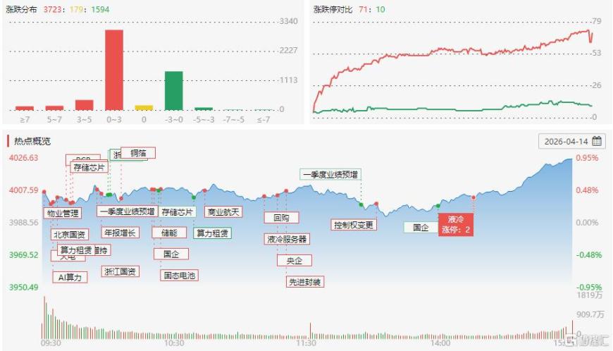 4月14日,沪深两市成交额2.38万亿,较上一个交易日放量2334亿。能源金属、存储芯片、电池、猪肉、半导体(核心股)、房地产(核心股)等板块上涨,油气股、煤炭(核心股)、汽车整车、港口航运、光伏设备等板块下挫。