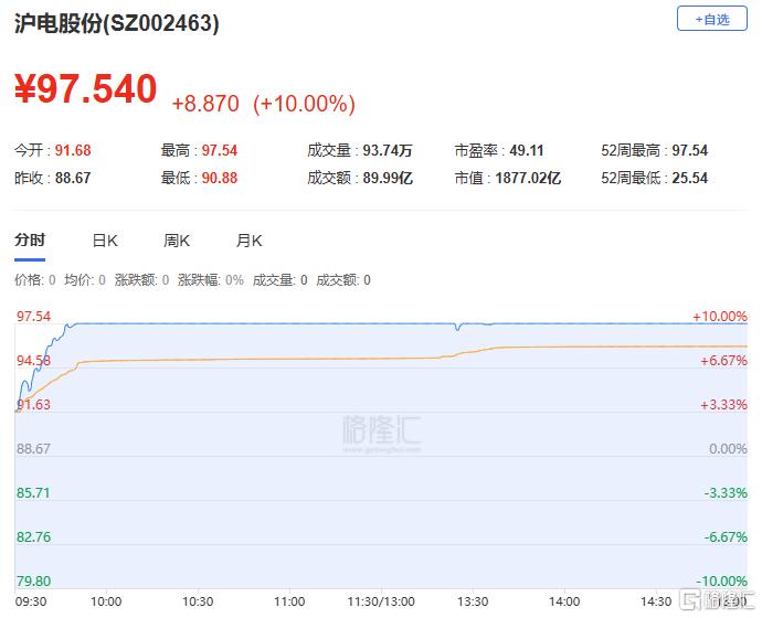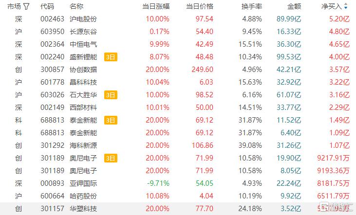 龙虎榜单日净买入额前三为沪电股份、长源东谷、中恒电气,分别为5.20亿元、4.80亿元、4.65亿元。