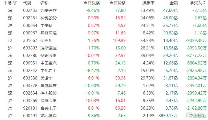 龙虎榜单日净卖出额前三为九安医疗、神剑股份、中安科,分别为3.13亿元、2.67亿元、1.66亿元。