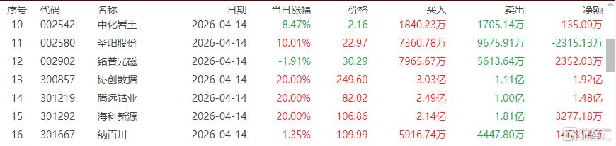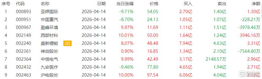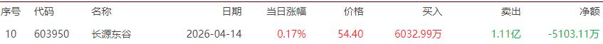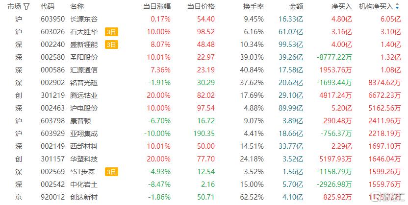 龙虎榜中涉及机构专用席位的个股中,当日净买入额前三为长源东谷、圣阳股份、汇源通信,分别为6.05亿元、1.32亿元、1.08亿元。