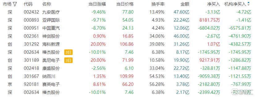 龙虎榜中涉及机构专用席位的个股中,当日净卖出额前三为九安医疗、亚钾国际、中国重汽,分别为4.72亿元、1.41亿元、6575.81万元。