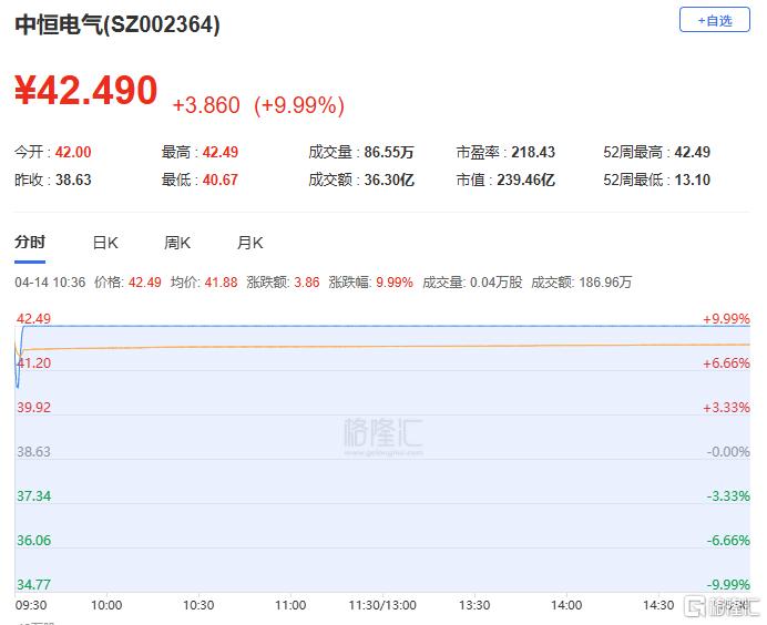 中恒电气:今日涨停,全天换手率15.51%,成交额36.30亿元,振幅4.48%。龙虎榜数据显示,深股通净买入2.96亿元,营业部席位合计净买入1.69亿元。