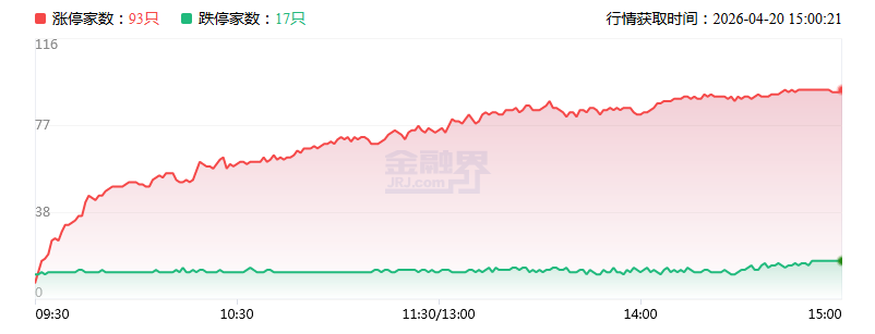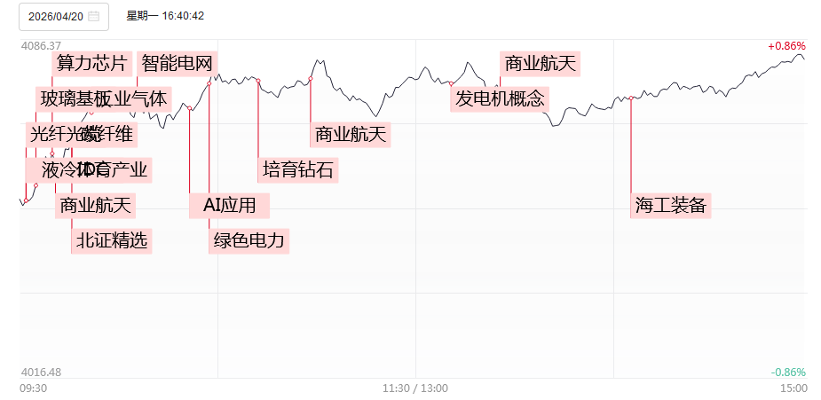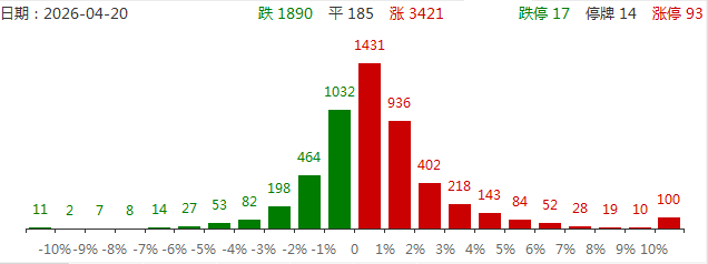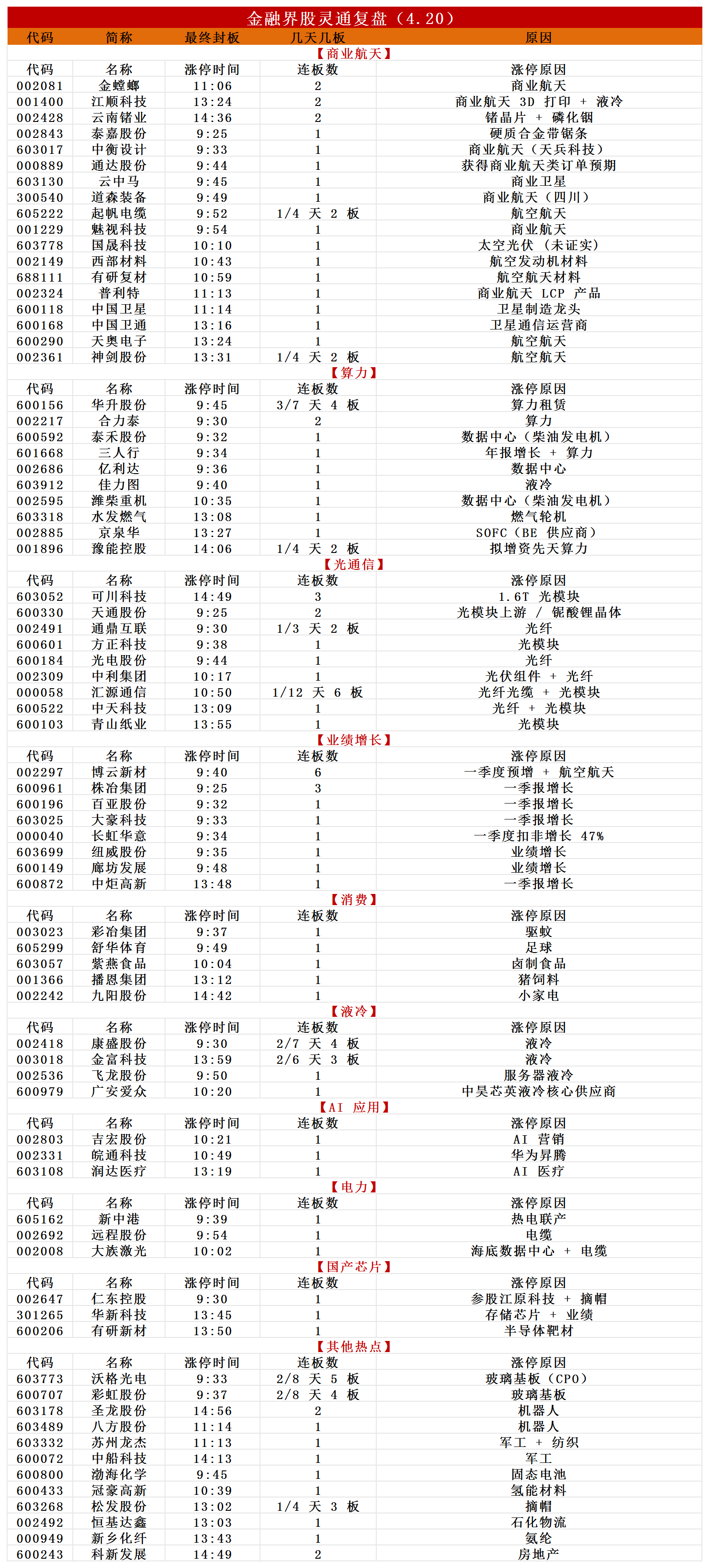 4月20日,全市场超3400只个股上涨,其中93只个股涨停。主题炒作有所回暖,商业航天(核心股)、AI应用、算力(核心股)芯片等热点快速轮动。从板块来看,商业航天概念爆发,十余只成分股涨停,起帆电缆、神剑股份均走出4天2板,中国卫通、中国卫星、西部材料、中衡设计涨停。光纤概念(核心股)快速拉升,通鼎互联3天2板,中天科技涨停。液冷服务器概念走强,康盛股份7天4板,金富科技6天3板,江顺科技2连板,英维克触及涨停,创历史新高。玻璃基板概念延续强势,沃格光电走出8天5板,续创历史新高,彩虹股份2连板。焦点股方面,圣阳股份尾盘炸板止步7连板,叠加了商业航天概念的博云新材继续缩量加速晋级6连板,沃格光电高开秒板走出8天5板录得2连板。