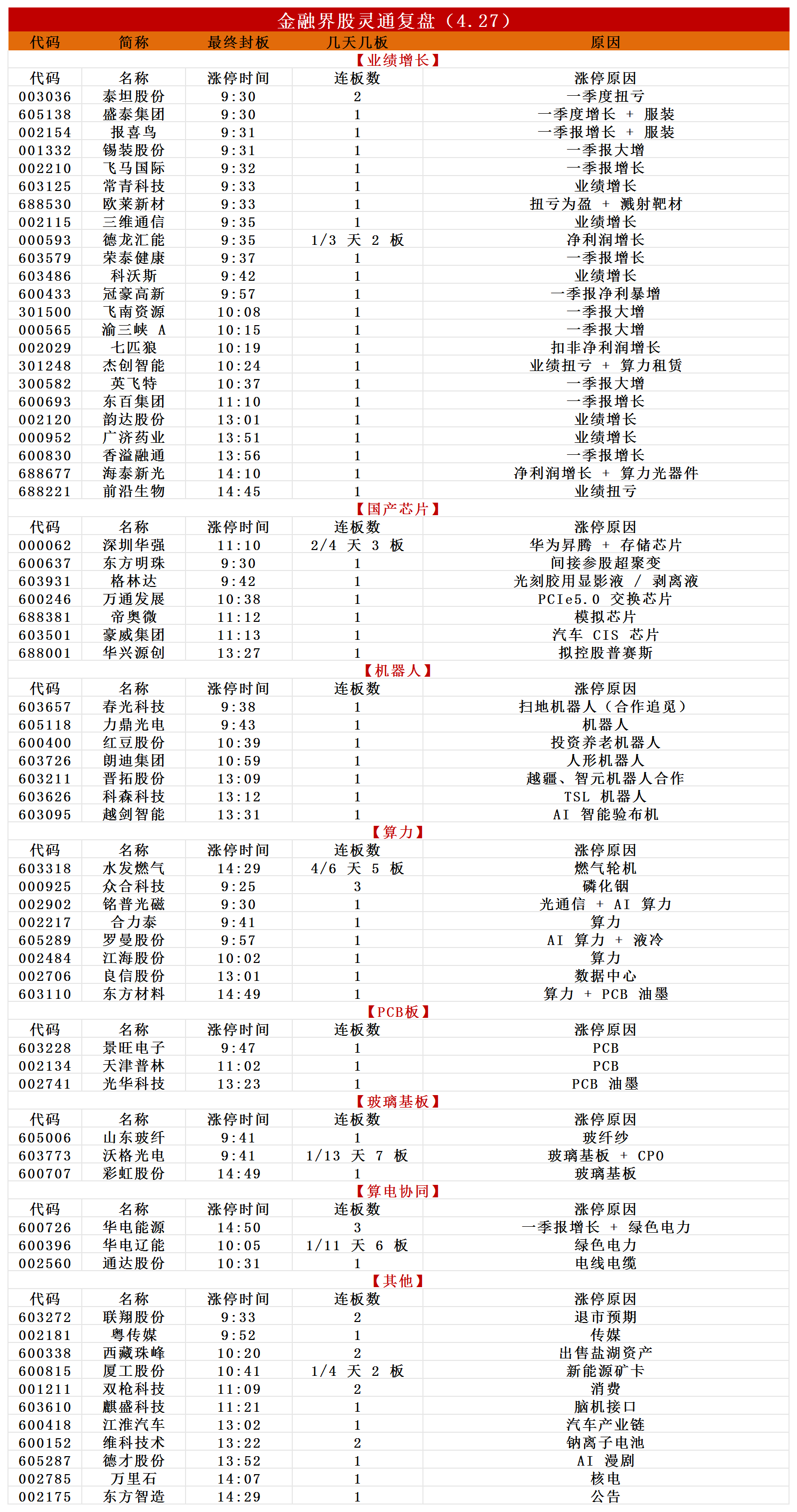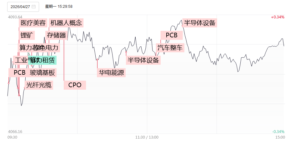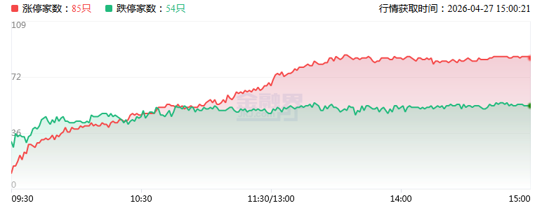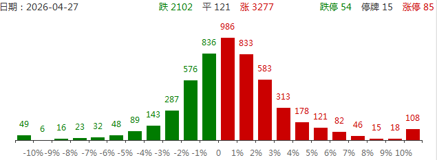 4月27日,炒作情绪有所回暖,水发燃气打开一字,放量涨停晋级4连板,成为市场高度板;华电能源上演“地天板”,走出3连板;人气股沃格光电、华电辽能均反包涨停。盘面上,市场热点快速轮动,全市场超3200只个股上涨。从板块来看,芯片产业链爆发,帝奥微、华兴源创、格林达、万通发展、朗迪集团均涨停,芯源微触及20CM涨停,长川科技涨超10%,创历史新高。CPO概念(核心股)震荡拉升,立讯精密触及涨停,创历史新高,铭普光磁涨停。PCB概念反复活跃,山东玻纤(核心股)、景旺电子、天津普林、光华科技涨停。锂电产业链表现活跃,西藏(核心股)珠峰、维科技术双双2连板。