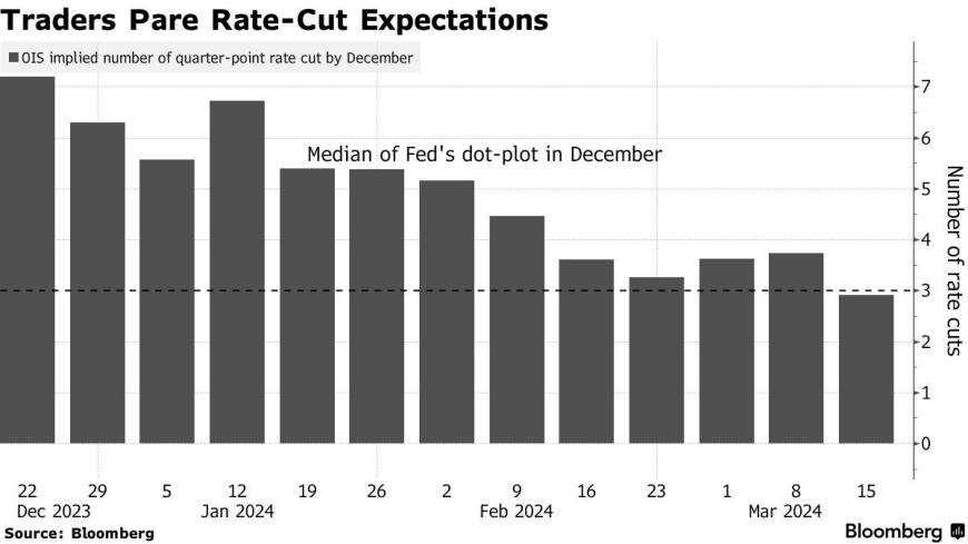 就在去年12月,债券交易员还几乎肯定美联储将在本周的会议上开始放松货币政策。但在一系列出人意料的强劲增长和(5.17,-0.03,-0.58%)通胀数据出炉后,他们认为本周加息的可能性为零,5月份加息的可能性很小,6月份降息的可能性仅为60%。就今年而言,交易员预计将总共降息71个基点,这意味着三次降息整整25个基点不再被认为是必然的。